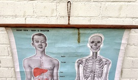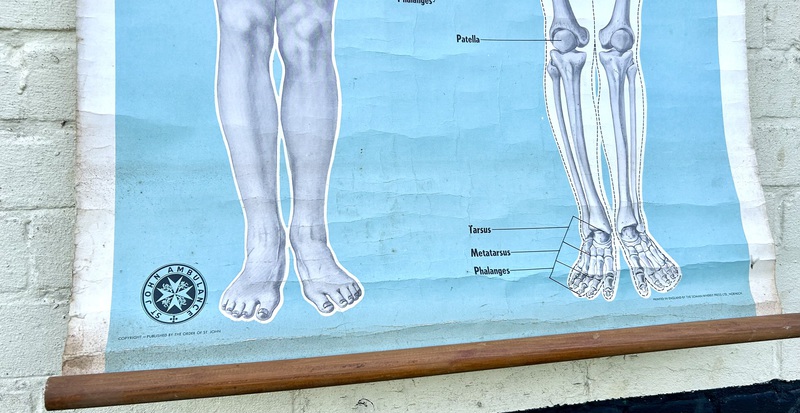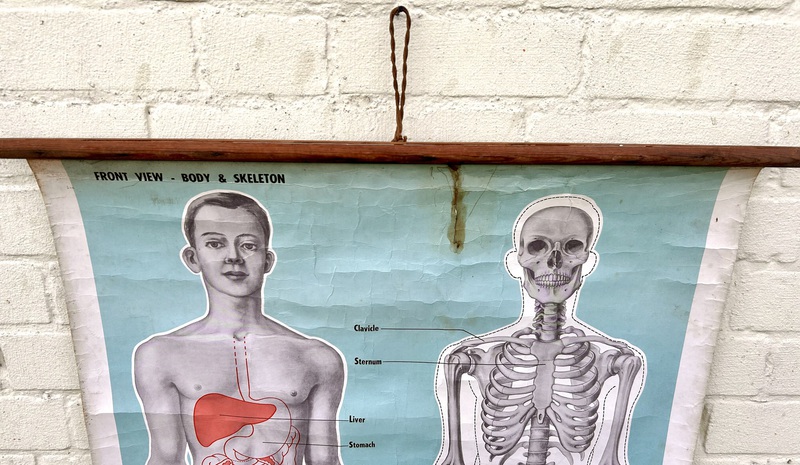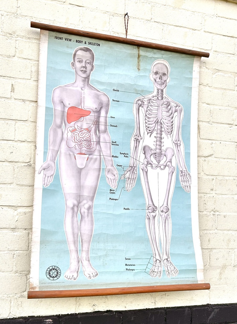 Description: Dating from the early 20th century, this fantastic large anatomical chart is a great piece of medical history, offering a great insight into the human body and skeleton. Complete with original wooden slates, the chart being produced by ST John ambulance and is a fantastic piece of wall art.