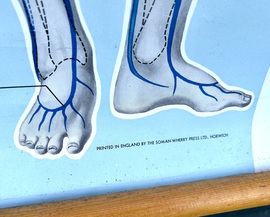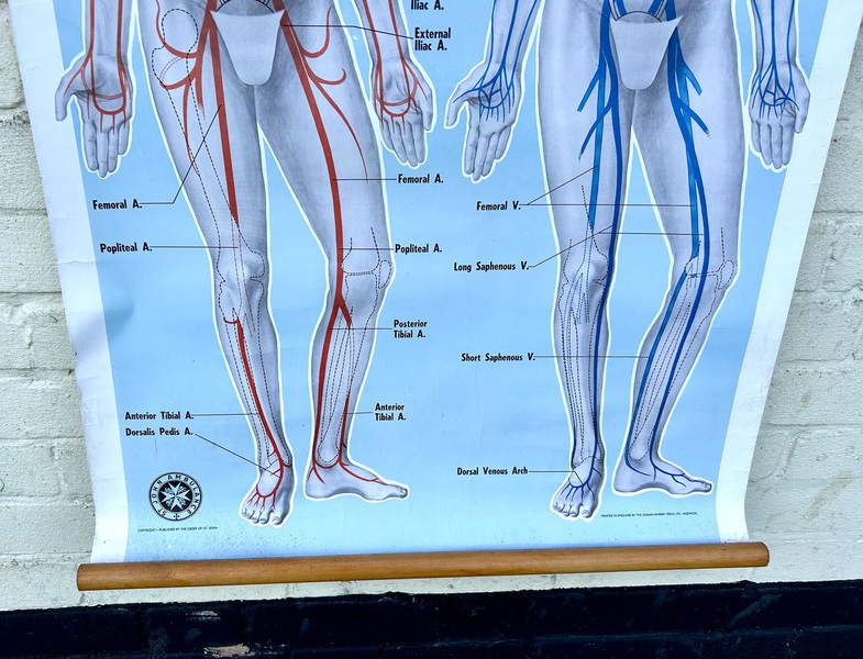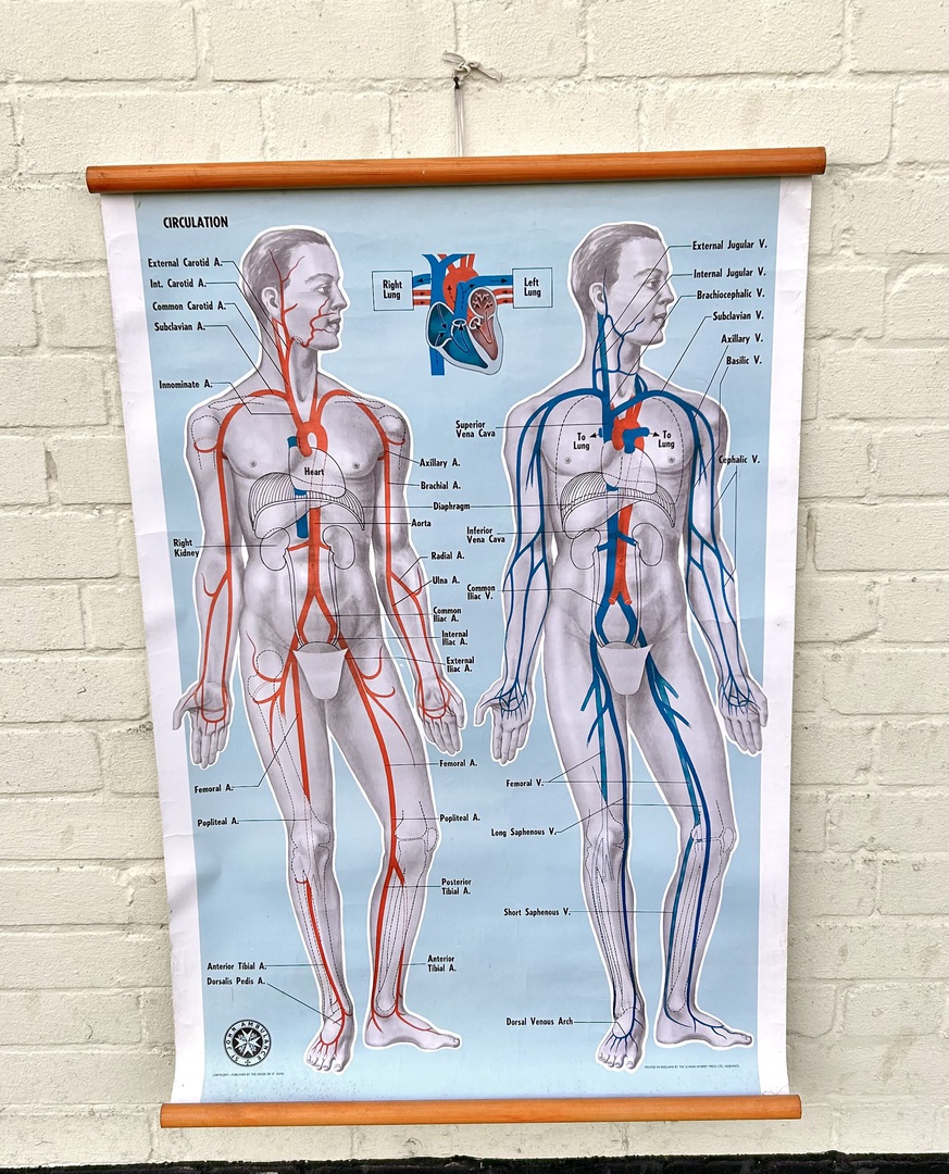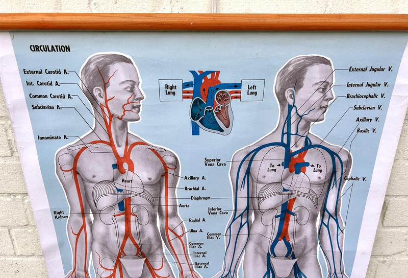 Description: Dating from the early 20th century, this fantastic large anatomical chart is a great piece of medical history, offering a great insight into the blood circulation the human body. Complete with original wooden slates, the chart being produced by ST John ambulance and is a fantastic piece of wall art.