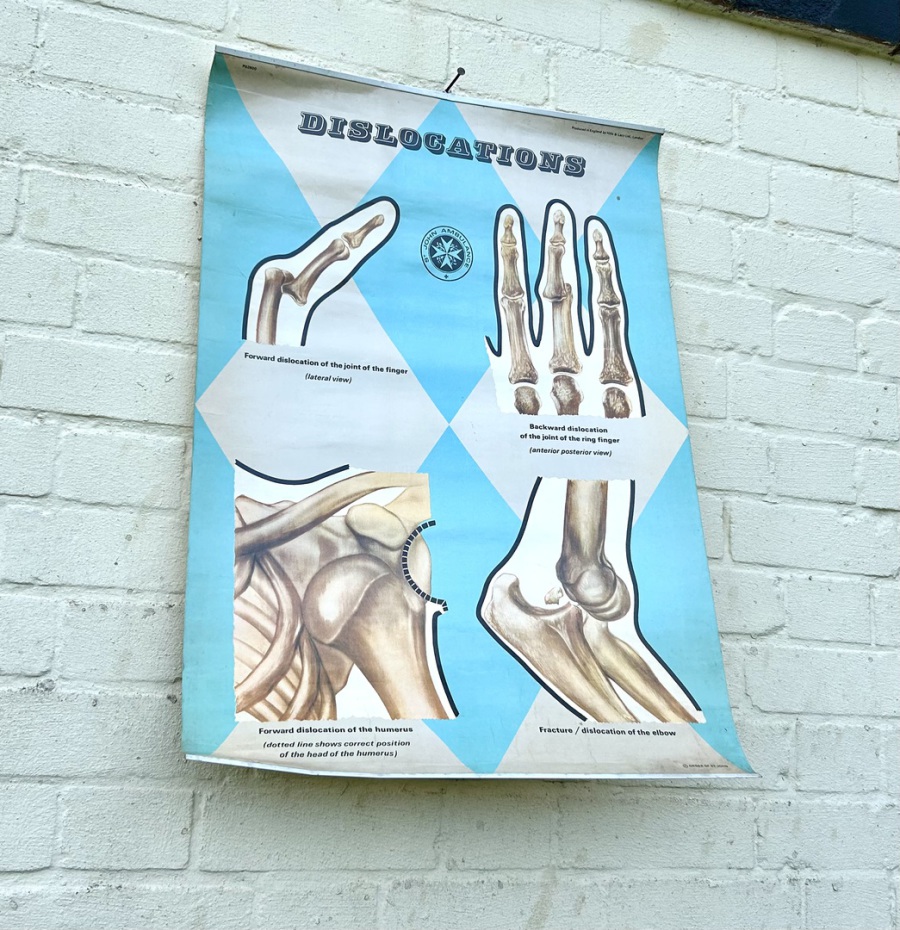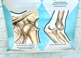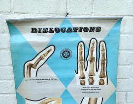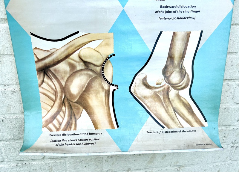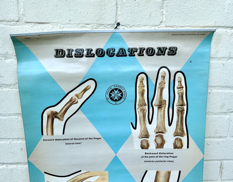 Description: Dating from the mid 20th century, this fantastic anatomical chart is a great piece of medical history, offering a great insight into different dislocations the human body could suffer. The chart being produced by ST. Johns ambulance and is a fantastic piece of wall art with vibrant colours a and graphics