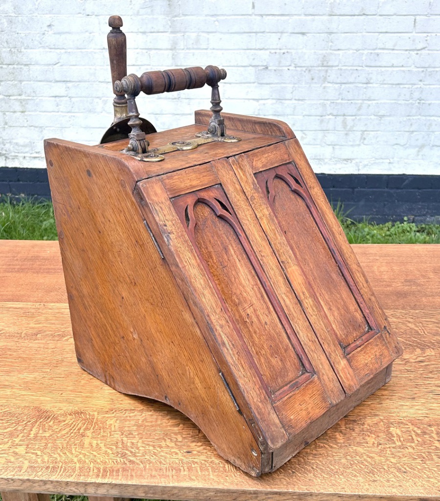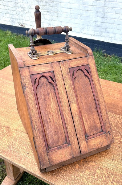Description: Stylish and highly original brass and oak coal scuttle, dating from circa 1900. The piece comes complete gothic arched detailing, original shovel, brass makers mark with original liner, lovely quality and would add effortless style to any period property.