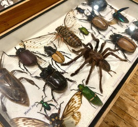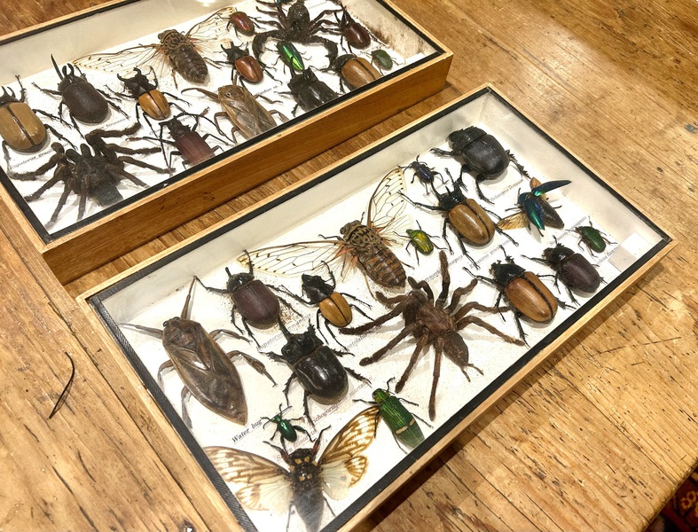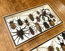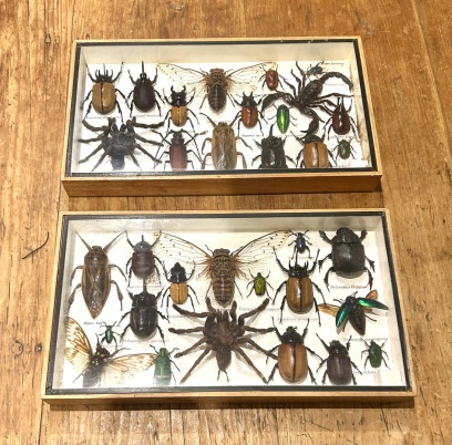 Description: Decorative and quirky vintage taxidermy insects inside original antique mahogany display case circa 1980s, very well presented with variety of insects, all labelled, would make a great little piece of décor any home