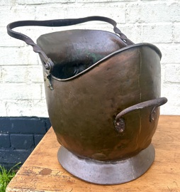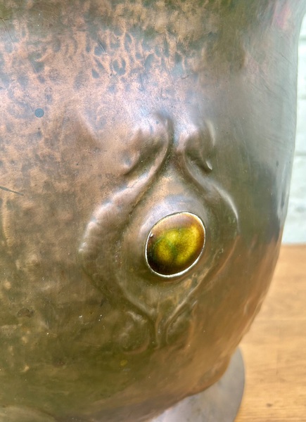 Description: Beautiful Arts and Crafts circa 1900 copper coal bucket, complete with twisted wrought iron handle with Ruskin ceramic stone to front, arts and crafts detailing and hand beaten finish, lovely quality and would add effortless style to any period property.