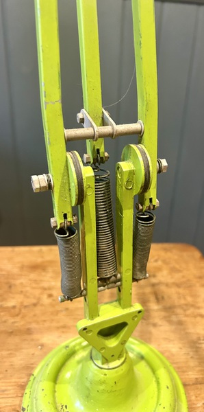 Description: Very authentic and stylish 1940s Dugdills industrial desk lamp, a very industrial lamp with steel frame, base with yellow paint and period green enamel