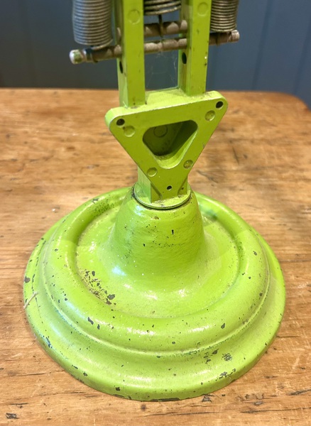 Description: Highly desirable and unusual 1940s Mek Elek factory lamp, a very industrial lamp with steel frame, original paint and green enamel shade. The lamp has three