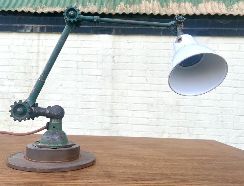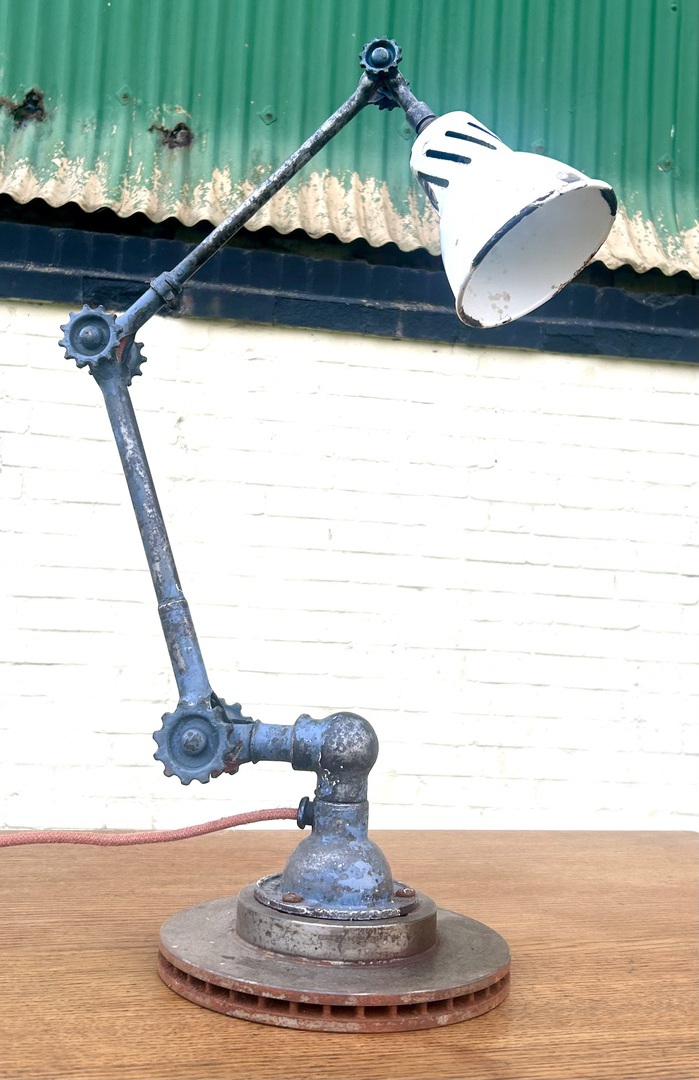 Description: Very Desirable and rare 1940s Dugdills industrial cog wheel desk lamp, very stylish lamp with three adjustable steel arms, lovely tapered base and an early vented white enamel shade. The lamp is one of the best industrial lamps ever made and a design icon, the lamp has been rewired with a rusty orange colour wire & has been mounted on a car brake disc, ready for the home