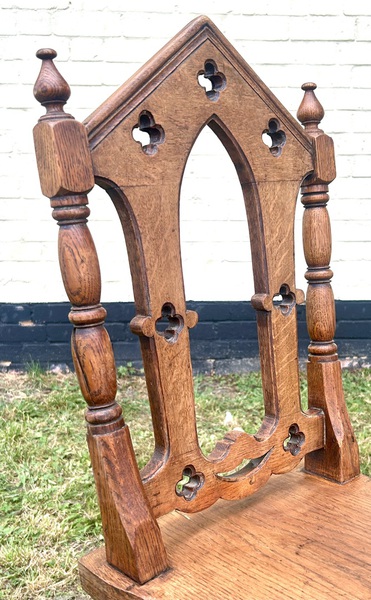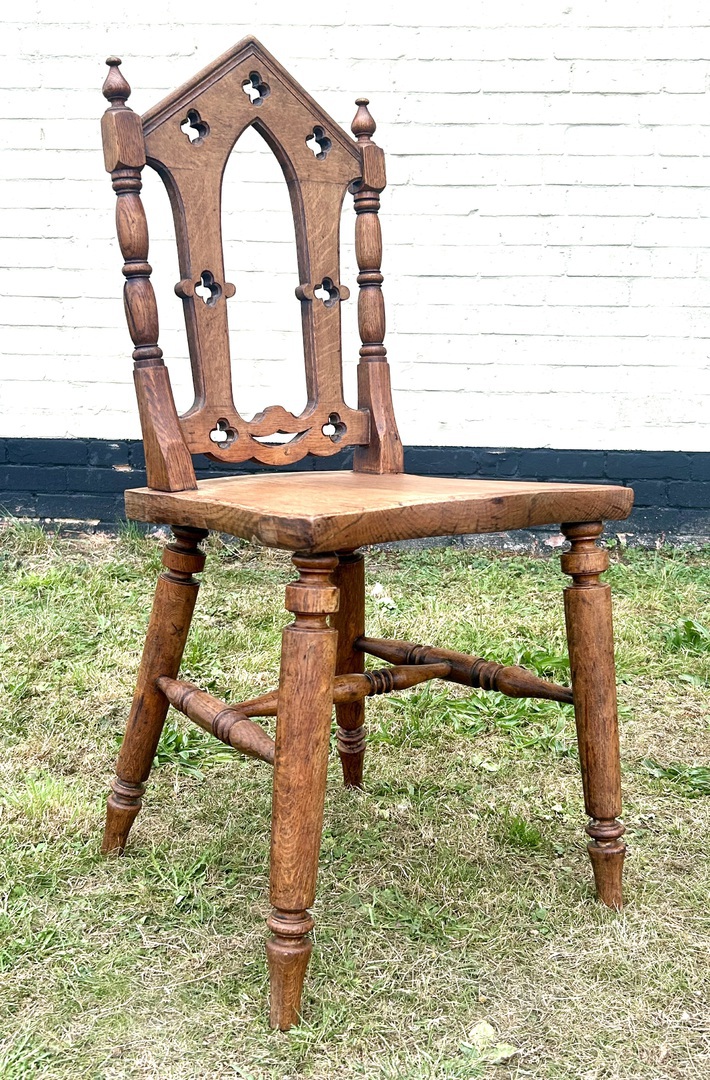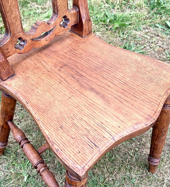 Description: Stunning and highly decorative early 1900s oak gothic revival hall chair. The chair has lovely features with skilfully turned frame, quatrefoil detailing and a curved seat, the chair is a fantastic example and would make great statement piece,