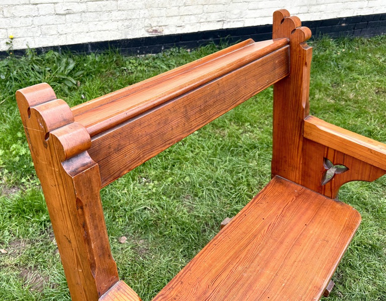 Description: Stunning and highly decorative late Victorian pine Glastonbury church chair. The chair has lovely carved gothic detail, x frame legs and curved armrests, the chair is a fantastic example with original and would make great statement piece,