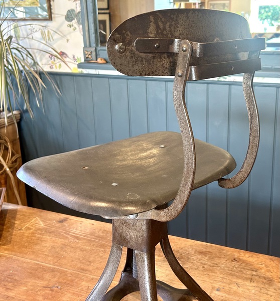 Description: Highly authentic and stylish 1950s Evertaut industrial machinist chair, complete with original grey paint to steel base, remnants of the original label and a thick wooden seat. This desirable, British made, iconic factory chair, has bags of character and charm, and would add to the decor in any house.