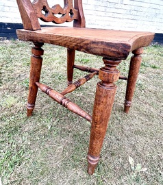 Description: Stunning and highly decorative late Victorian oak and Ash hall side chair. The chair has some exquisite detail, the back rest has a sunrise design, Egyptian influences and heraldic shield, beautifully turned front legs and saber back legs, the chair is a fantastic example and would make great statement piece,