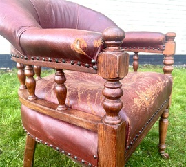 Condition : The chair is in poor condition for age and currently only usable as a prop, the upholstery needs completely redoing and the bottom of the chair needs securing. The chair has high quality oak structure and castors but needs work to bring back to former glory