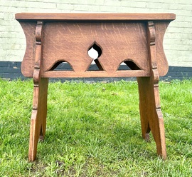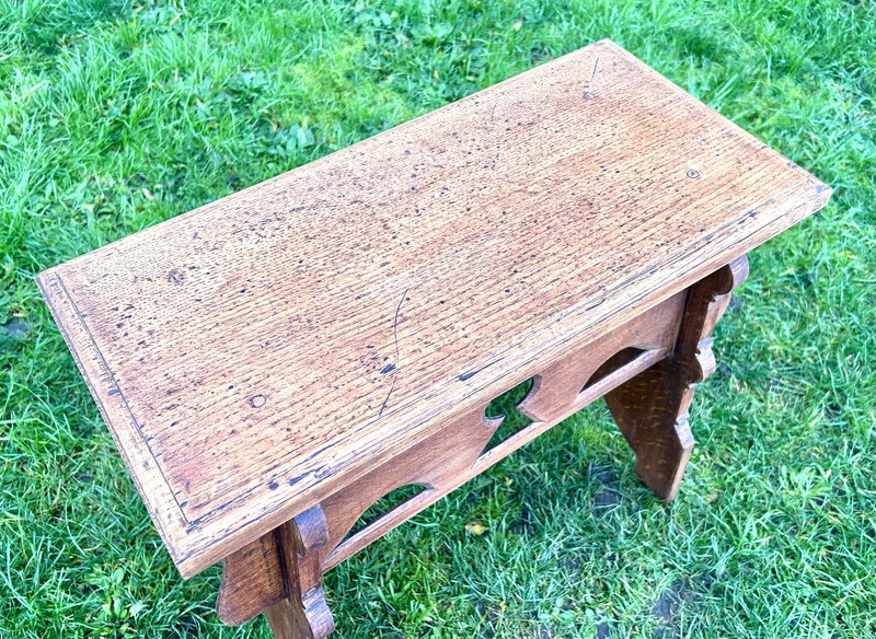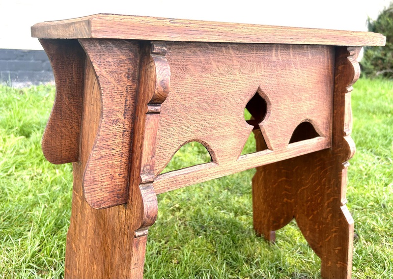 Description: Stunning and high quality early 1900s Arts and Crafts oak stool The stool has classic features including period motifs cut outs, carved detailing to the legs and lovely grain, a charming and quaint stool with fantastic details, ideal for many settings.
