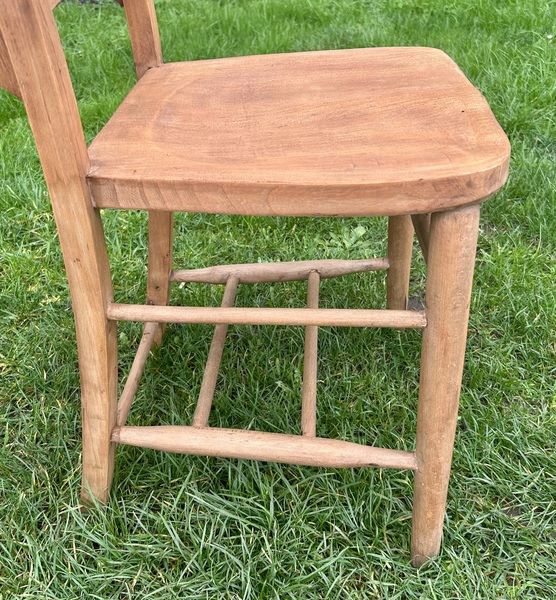 Description: Highly original and stylish elm chapel church chairs, dating from early 1900s. These chairs are full of character, complete with lovely curved seats, bible holder and spindle stretchers, perfect for rustic farmhouse kitchens.