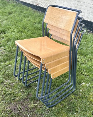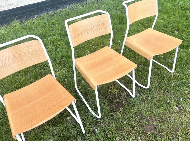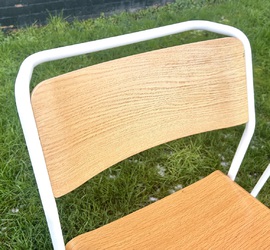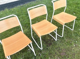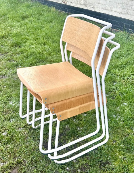 Description: Highly desirable and original adult canteen utility stacking chairs produced by Very Good & Proper Company. The seats are made out of formed oak plywood with tubular white steel metal frames, retailing for £315 each. The chairs are highly practical seating that can be stacked to save space, perfect for rustic kitchens to vintage restaurants.