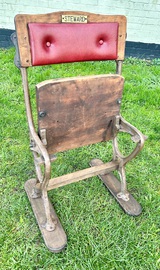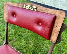 Description: Stunning and desirable 1940s vintage one seater folding theatre chair. The chair was original from a theatre in Leicester. The frames are cast iron, the seat mahogany with a red leatherette with original Stewards plate to the chair. The chair is highly practical seating, that can be folded to save space, perfect for stylish hallway addition, bedroom seating or vintage restaurants.