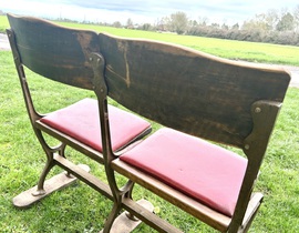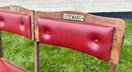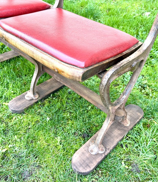 Description: Stunning and desirable 1940s vintage two seater folding theatre chairs. The chairs were original from a theatre in Leicester. The frames are cast iron, the seats mahogany with a red leatherette with original Stewards plate to both chairs. The chairs are highly practical seating that can be folded to save space, perfect for stylish hallway addition, bedroom seating or vintage restaurants.