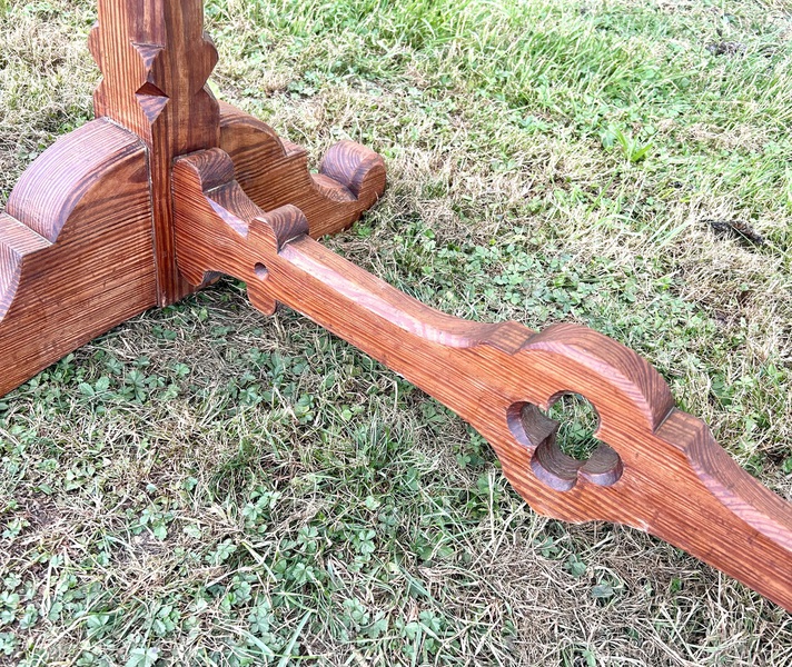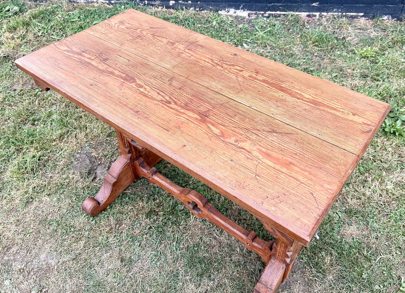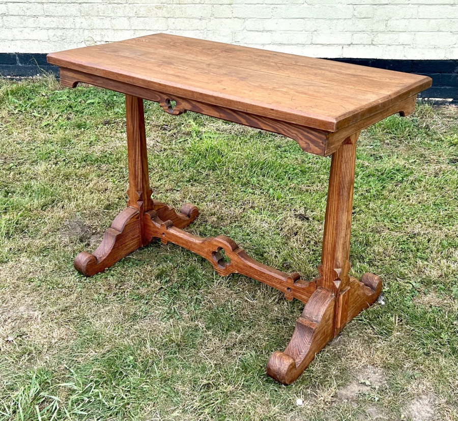 Description: Highly desirable and original Gothic farmhouse pitch pine side console table, dating from late Victorian era. The table has wonderful ecclesiastical gothic design, with quatrefoil detailing and curved legs. A charming and practical item with fantastic patina and history, ideal for many settings such as a kitchen Island/large side table, or used in a commercial setting