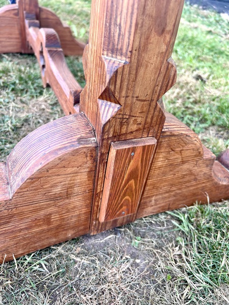 Description: Highly desirable and original Gothic farmhouse pitch pine kitchen table, dating from late Victorian era. The table has wonderful ecclesiastical gothic design, with studded detailing and carved legs. A charming and practical item with fantastic patina and history, ideal for many settings such as a kitchen Island/large side table, or used in a commercial setting