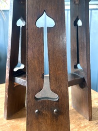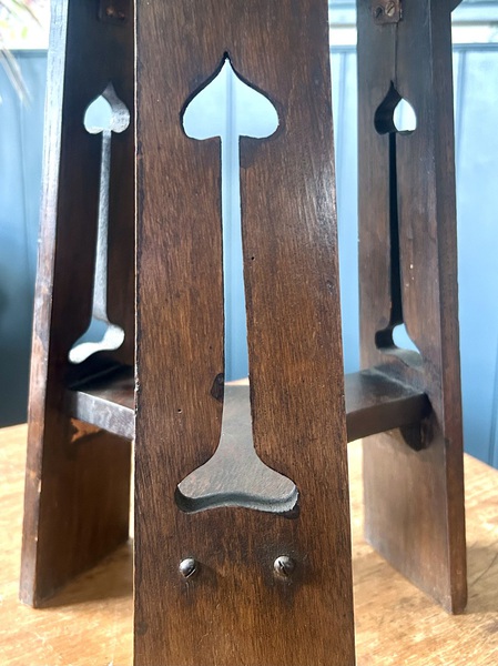 Description: Stunning and stylish late 19th century Arts and Crafts oak side table. The table has lovely period features including heart detailing to the top, period carved motifs to the side and turned legs, a charming and quaint table with fantastic details, ideal for many settings.