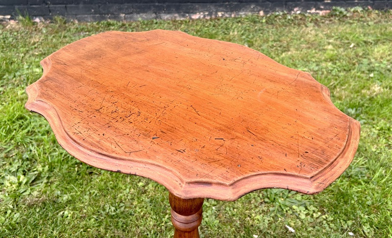 Description: Quaint and highly original late 19th century Victorian mahogany side/wine table. The table has some lovely features, with a curved top, carved turn column and tripod leg base. A charming and elegant table with fantastic details, ideal for many settings.