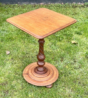 Description: Quaint and highly original late 19th century Victorian mahogany side table. The table has some lovely features, with a waterfall edge square top, carved turn column, turned circular base with bun feet. A charming and elegant table with fantastic details, ideal for many settings.