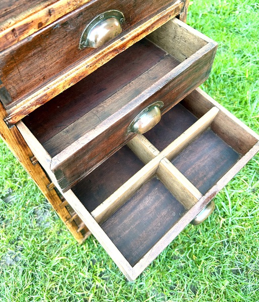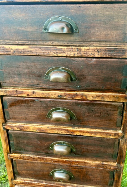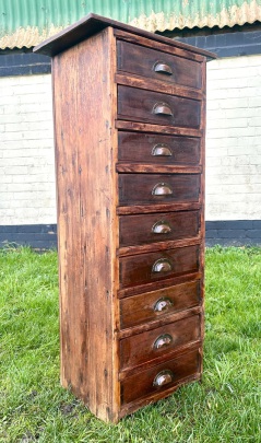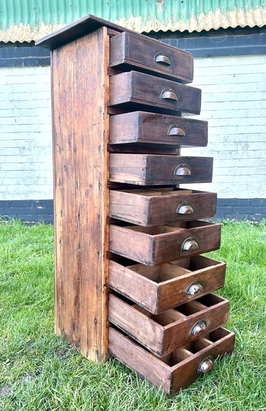 Description: Unusual and highly desirable nine drawer cabinet, made from pine, scratch built with copper handles, some sectioned drawers and dating from the early 1900s. A charming item that is highly practical and would make a stylish alternative for storage.