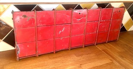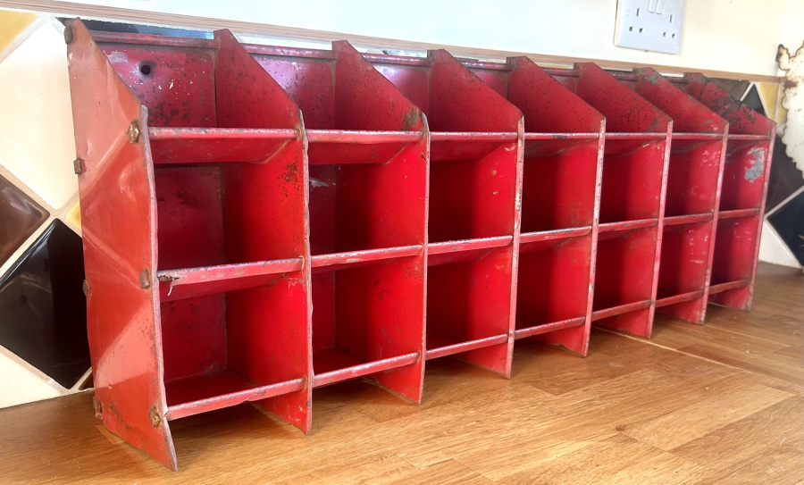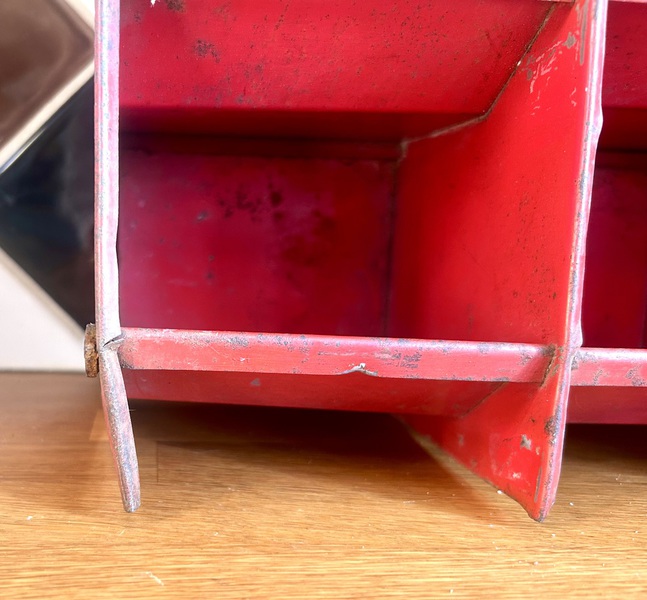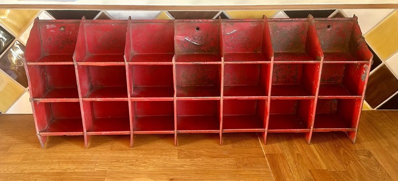 Description: Wonderful and highly original 1970s metal 21 sectioned pigeon hole industrial rack, in vibrant red. The rack is highly practical, making a great design alternative for storage in the kitchen, garage etc.